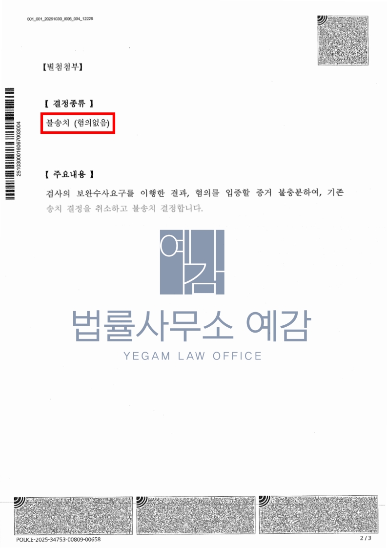 법률사무소 예감의 변론은 모두 받아들여졌고 전체 범죄에 대하여 불송치결정되었습니다.